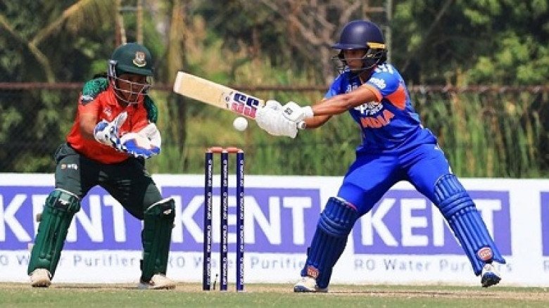 টস জিতে ব্যাট করার সিদ্ধান্ত নেয় ভারতের মেয়েরা। ব্যাট করতে নেমে শুরুতে ভারতের ওপর চাপ সৃষ্টি করে বাংলাদেশের মেয়েরা। ৪৪ রানেই তুলে নেয় ভারতের ৪টি উইকেট। এরপরই ঘুরে দাঁড়ায় ভারতীয় মেয়েরা। তেজাল হাসাবনিস ও রাধা যাদবের ব্যাটে ৭৯ রানের জুটি গড়ে ঘুরে দাঁড়ায় তারা। ৩০ বলে ৩৬ রান করে রাধা যাদব আউট হয়ে গেলেও তেজাল হাসাবনিস ৩৪ বলে ৫১ রানে অপরাজিত থাকেন।